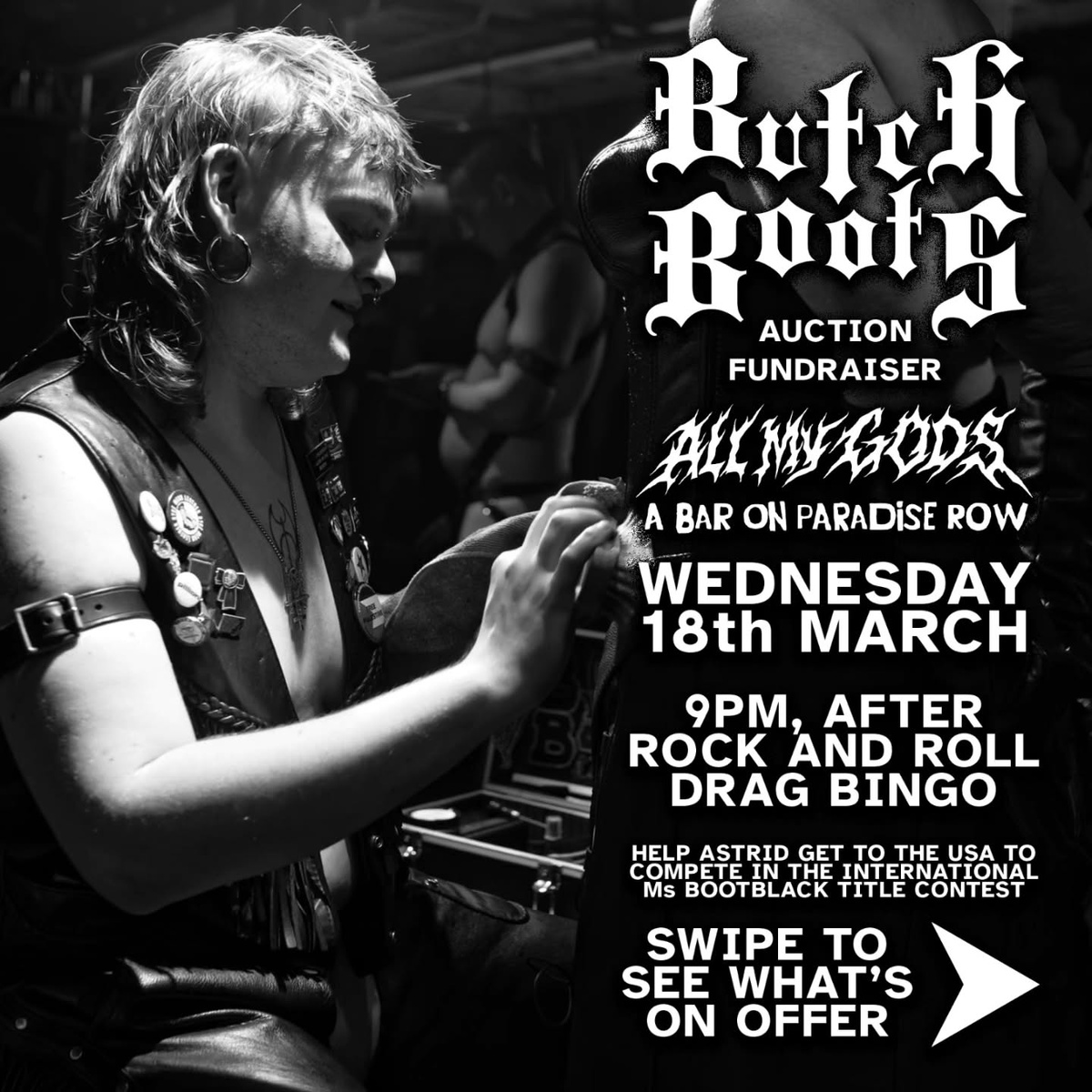 Astrid, recent winner of European Bootblack 2026, is heading off to IMsBB and on Wednesday 18th or march doing an auction fundraiser for her travel fund and the auction items are: