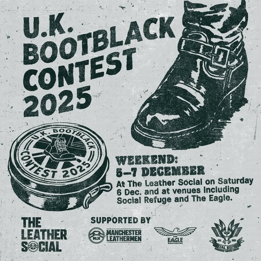 The UK Bootblack Contest aims to celebrate the technical expertise, creativity, and passion of bootblacks in the UK. Whether you’re new to bootblacking or a seasoned pro, this contest offers an exciting opportunity to learn, connect, and grow within the community. This year we will be holding the public portions of the contest at Social Refuge and The Eagle Bar in Manchester. Come and support our fabulous contestants, sit for them, get your boots shined and your leathers cared for, socialise, and have some fun!